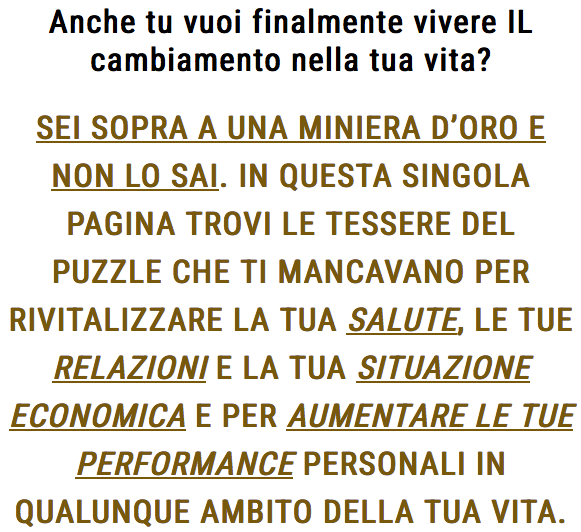 Il mio nuovo progetto: La Miniera D'Oro . Sto preparando un'area riservata in cui condividere TUTTO quello che ho scoperto, che funziona in autonomia. La mia nuova pagina che sto realizzando sul mio sito web inizia così. Sto condensando tutto in un unico posto. Chi salirà sul treno andrà davvero incontro al cambiamento. Per chi ha piacere continuerò a mandare gli aggiornamenti